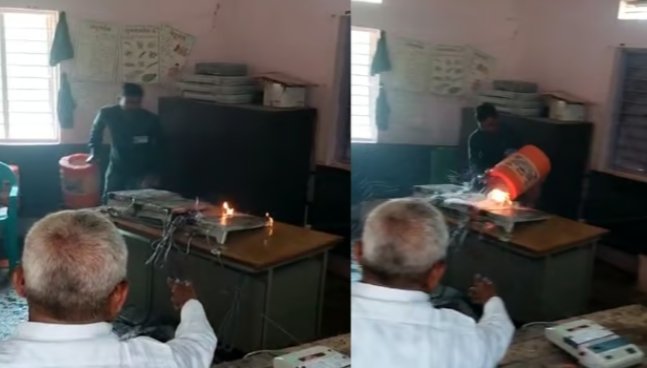 🟥मतदान प्रक्रिया सुरुळित सुरू असतानाच सांगोला तालुक्यातील बागलवाडी येथे एक खळबळजनक घटना घटली आहे. मतदानासाठी आलेल्या एका तरुणाने ईव्हीएम मशीनवर पेट्रोल टाकून जाळण्याचा प्रयत्न केला. यामुळे मतदान केंद्रावर चांगलीत पळापळ झाली. या तरुणाने मराठा आरक्षणाच्या मुद्द्यावरून संतप्त होत ईव्हीएम पेटवल्याची माहिती समोर आली आहे. मतदान केंद्रातील अधिकाऱ्यांनी संबंधित तरुणाला पकडून पोलिसांच्या ताब्यात दिलं आहे. मतदान अधिकाऱ्याने सांगितले की, यामुळे मतदान प्रक्रियेवर कोणताही परिणाम झालेला नाही. ईव्हीएम पूर्णपणे जळालं असून नवीन ईव्हीएम आणून मतदान प्रक्रिया पुन्हा सुरू केली गेली.
