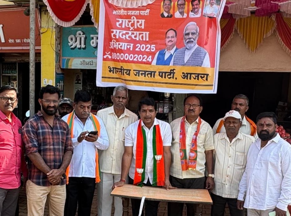आजरा येथील छ संभाजी महाराज चौक आजरा येथे भारतीय जनता पार्टी च्या कार्यकर्त्यानी देशभरामध्ये चालू असलेल संघटन पर्व २०२४ मढ़ील सभासद नोंदनी अभियान राबविले आले. देशभरमद्ये १३ कोटी सभासद संख्या आसनारी विश्वतील सगल्यात मोठा राजकीय पक्ष म्हणुन भाजपा पक्ष परिचित आहे.