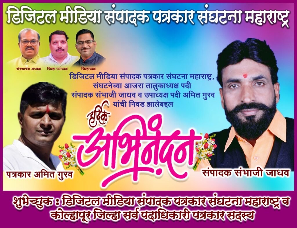 डिजिटल मिडिया संपादक पत्रकार संघटना महाराष्ट्रच्या गडहिंग्लज तालुकाध्यक्षपदी नितीन मोरे तर उपाध्यक्ष अभिजीत मांगले,सचिव अमित कांबळे व खजिनदारपदी धनंजय शेटके यांची निवड करण्यात आली आहे.