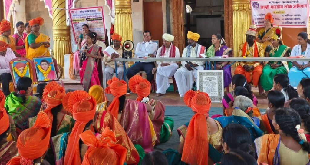 नऊवारी साड्या, फेटे बांधून गावातील महिलांनी सहभाग घेतला होता. छत्रपती शिवाजी महाराज ,राजमाता जिजाऊ, डॉक्टर बाबासाहेब आंबेडकर, रमाबाई आंबेडकर ,इंदिरा गांधी अशा विविध वेशभूषा करून शाळांचे विद्यार्थी, विद्यार्थिनी, शिक्षक ,सर्व ग्रामपंचायत पदाधिकारी, महिला बचत गट, आरोग्य विभाग यांचा सहभाग होता. सुरुवातीला भैरीदेव मंदिर पासून सुरू झालेली पदयात्रा, गावातून फिरून भैरी मंदिरासमोर आल्यानंतर सावित्रीबाई फुले महात्मा फुले यांच्या प्रतिमेचे पूजन सरपंच रूपालीताई पाटील यांच्या हस्ते झाले. प्रास्ताविक भाषणात पोलीस पाटील व गटाच्या प्रमुख मनीषा गुरव यांनी कार्यक्रमाचा हेतू स्पष्ट करून गावात सर्वसमावेशक कार्यक्रम घेऊन महिलांचा मान व समानता कशी असावी याबाबत मार्गदर्शन केले. यावेळी सूर्यकांत पाटील, शिवाजी गुरव, शिवाजी जाधव, माध्यमिक विद्यालयाचे मुख्याध्यापक शरद पाटील, प्राथमिक शाळेचे मुख्याध्यापक,शिक्षक सर्व शिक्षिका यांचे मनोगत व मार्गदर्शन झाले. यावेळी लेझीम पथकाचे मार्गदर्शक कृष्णा शिवणे, हलगी वादक अण्णासो जाधव, शिवाजी पोवार, चंद्रकांत गुरव, जालिंदर डवरी यांचा सत्कार करण्यात आला. या सर्व कार्यक्रमाचे आयोजन ‘क्रांतीज्योती संविधान महिला गट’ यांनी केल्याने व संविधानातील मूल्यांना धरून कार्यक्रम केला याबद्दल सर्वत्र कौतुक होत आहे. कार्यक्रमाच्या वेळी हर्षदा चव्हाण या विद्यार्थिनीने ‘लाटी-काठी’ खेळत कार्यक्रमाची शोभा वाढवली. तसेच शाळेच्या मुला मुलींनीही आपली मनोगते व्यक्त केली. कार्यक्रमासाठी ज्यांनी ज्यांनी सहकार्य व उत्स्फूर्तपणे सहभाग घेतला त्या सर्वांचे आभार मानताना उपकेंद्राच्या डॉक्टर रीना यांनी आरोग्य बाबत मार्गदर्शन करून शेवटी आभार मानले. त्यानंतर कार्यक्रमाची सांगता झाली.