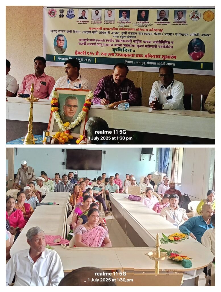 मुख्यमंत्री प्रशासकीय गतिमानता अभियान कोल्हापूर महाराष्ट्र शासन कृषी विभाग तालुका कृषी अधिकारी आजरा कृषी तंत्रज्ञान व्यवस्थापन संस्था आत्मा व पंचायत समिती आजरा यांच्या संयुक्त विद्यमानाने. महाराष्ट्राचे माजी मुख्यमंत्री स्वर्गीय वसंतरावजी नाईक यांच्या जयंतीनिमित्त व राजश्री शाहू महाराज यांच्या शतकोत्तर सुवर्ण महोत्सवी वर्षानिमित्त कृषी दिन व हेक्टरी १२५ मे टन ऊस उत्पादन वाढ अभियान शुभारंभ मंगळवार दि १ रोजी पंचायत समिती सभागृह आजरा येथे संपन्न झाला. कार्यक्रमाचे अध्यक्ष तहसीलदार समीर माने होते. तसेच सहअध्यक्ष सहाय्यक गटविकास अधिकारी दिनेश शेटे, व ता. कृषी अधिकारी भुषण पाटील होते.