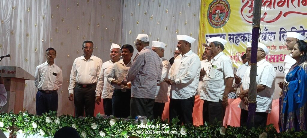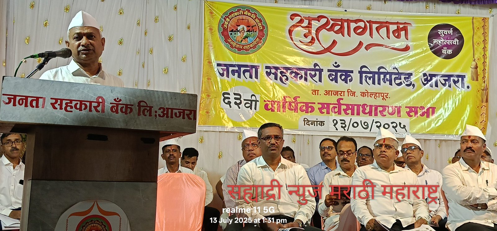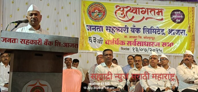 आजरा येथील जनता सहकारी बँक लिमिटेड आजरा ६३ वी वार्षिक सर्वसाधारण सभा दि. १३/७/२०२५ रोजी खेळीमेत संपन्न झाली. स्वागत व प्रास्ताविक व ३१/०३/२०२५ रोजी संपलेल्या आर्थिक वर्षाचा वार्षिक अहवाल, लेखापरिक्षण अहवाल, ताळेबंद, नफा तोटा पत्रक व इतर विषय संचालक मंडळाच्या वतीने सादर चेअरमन मुकुंदराव देसाई यांनी केले चेअरमन श्री देसाई म्हणाले. जनता सहकारी बॅक योग्य दिशेने मार्गक्रमण करत आहे. सर्वांचे श्रद्धास्थान व बँकेचे कुटूंब प्रमुख कै. अमृतकाका देसाई व कै. बळीरामजी देसाई यांचे विचार प्राणपणाने जोपासून त्यांची दुरदृष्टी, नाविण्यपूर्ण कल्पकता, विकासाभिमुख नेतृत्वाखाली व मौलीक मार्गदर्शनाने बँकेने बँकींग क्षेत्रात आपला वेगळा ठसा उमटवून प्रगतीचा आलेख कायम राखला आहे.