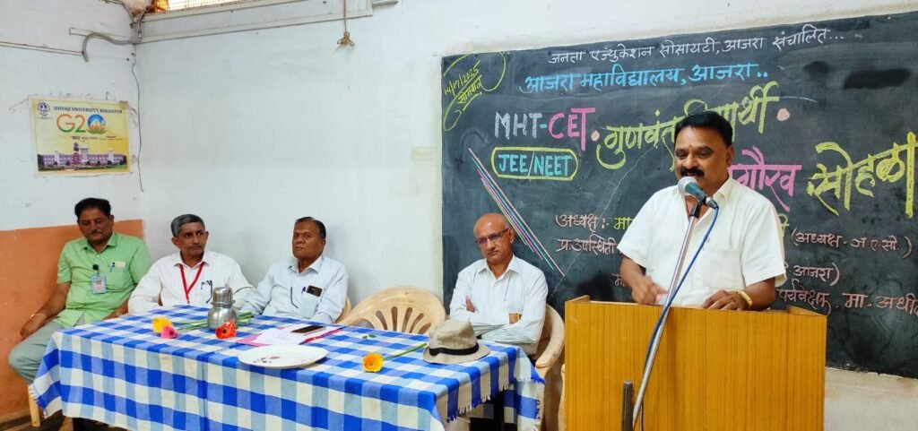 आजरा महाविद्यालयामध्ये गुणवंत विद्यार्थ्यांचा गुणगौरव सोहळा दिनांक १४ रोजी आजरा महाविद्यालयात MHT- CET, JEE, NEET व Law CET मध्ये गुणवंत विद्यार्थ्यांचा गुणगौरव सोहळा पार पडला. या कार्यक्रमाचे अध्यक्षस्थान जनता शिक्षण संस्थेचे अध्यक्ष अशोक चराटी होते. श्री. चराटी यांनी विद्यार्थ्यांना तणावमुक्त अभ्यास करून हसत खेळत येणाऱ्या परिस्थितीस सामोरे जावे. तसेच यश मिळवण्यासाठी लढण्यास सज्ज राहावे. भविष्यात यशाची शिखरे पादाक्रांत करून महाविद्यालयाचे नाव उज्वल करावे असे सांगितले व पुढील वाटचालीस शुभेच्छा दिल्या.