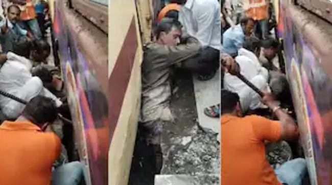 🟥रेल्वेतून उतरताना प्रवासी घसरला – रेल्वेखाली अडकला.