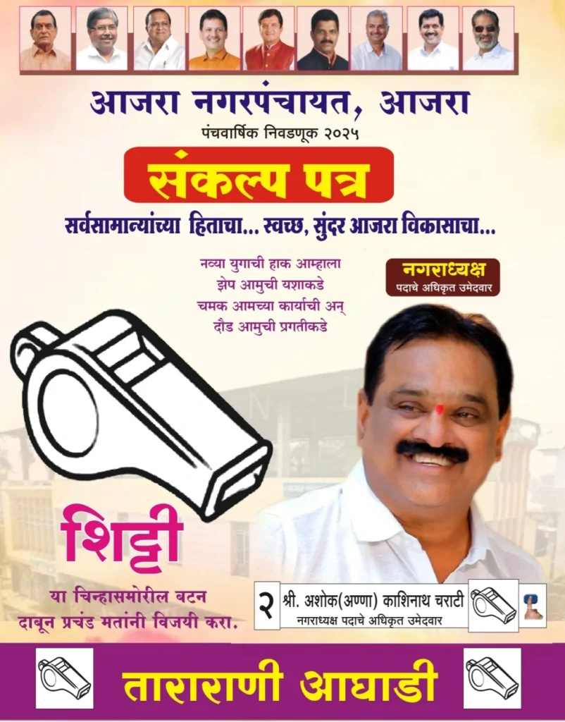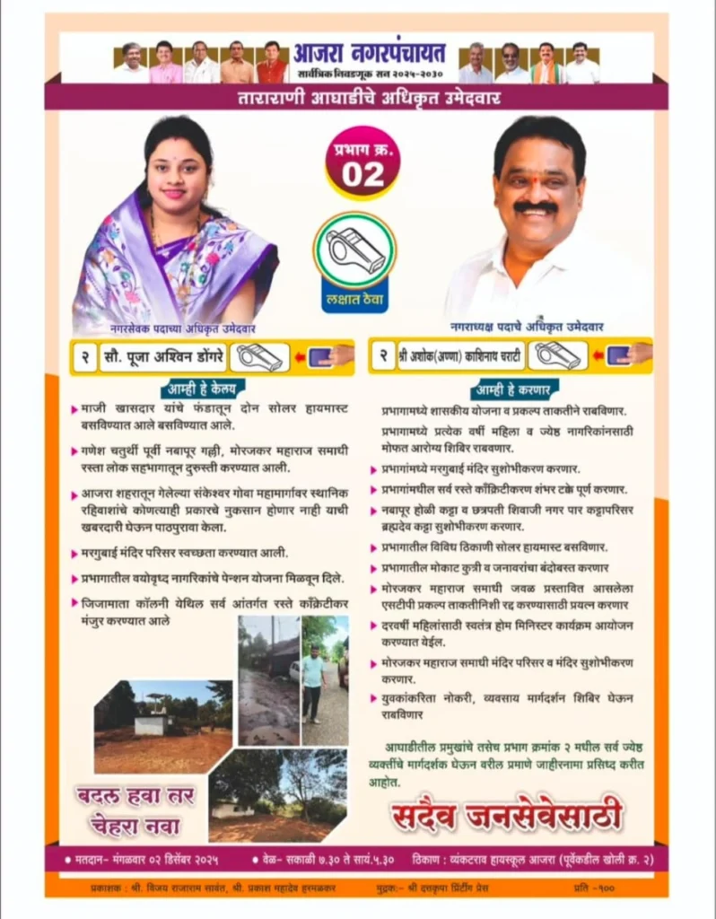 या बरोबरच गेल्या निवडणुकीत सत्तेवर आलेल्या भाजप प्रणीत पार्टीकडून आजन्याच्या जनतेची धोर फसवणूक झालेली आहे. एकंदर सर्वच विकासकामामध्ये सत्तारूढ नेतृत्वाने मोठे ढपले पडण्याचा प्रयत्न केला असल्यामुळे त्याचा दर्जा शून्य झालेला आहे. कोट्यावधी रुपयांच्या पाइपलाईन योजनेमधून कोट्यावधी रुपयांचे काढलेले कमिशन, नगरसेवकांना कामे वाटून दिल्यामुळे कुंपणालाच शेत खायला देण्याचे झालेलें प्रकार या सगळ्या बाबींवर विचार केला असता सत्तारूढ आघाडी आजऱ्याच्या सत्तेपासून दूर ठेवणे हि काळाची गरज निर्माण झाली आहे.