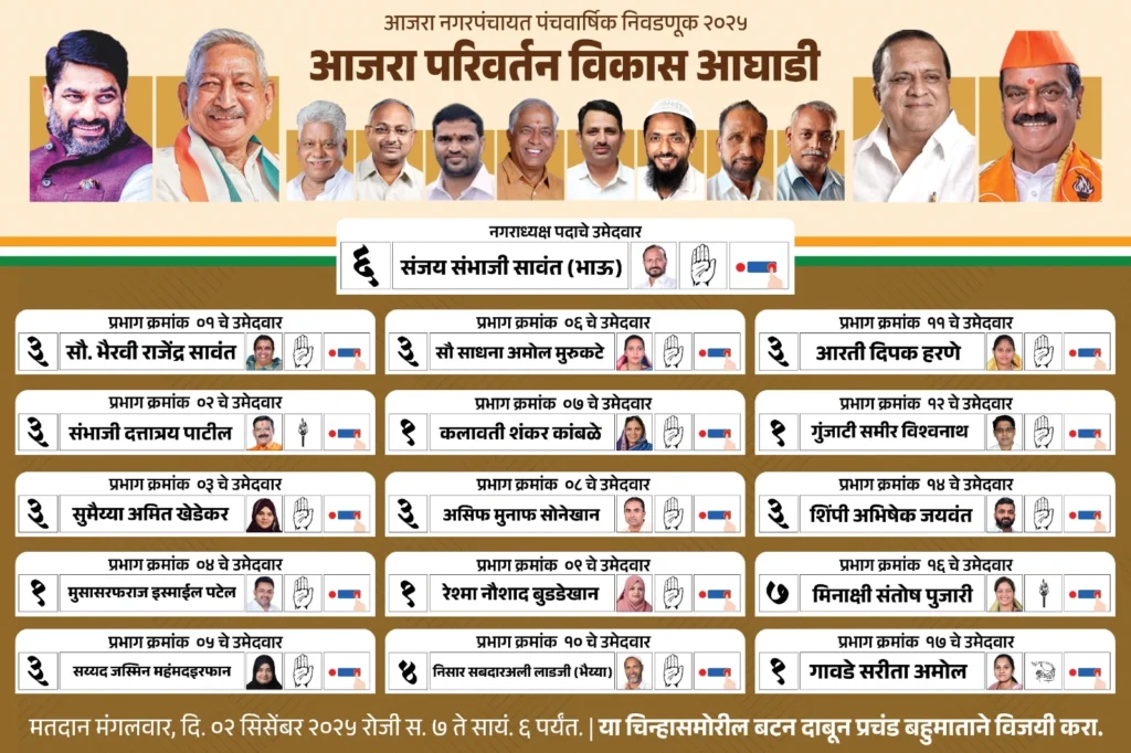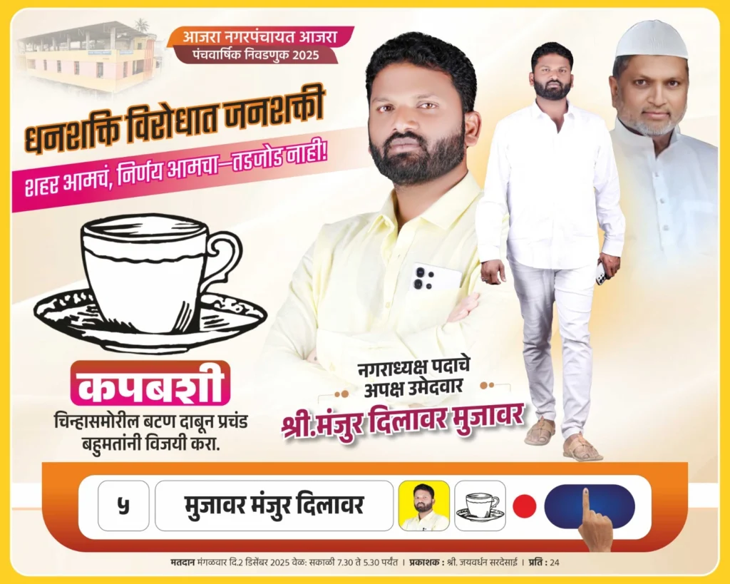 आजऱा शहराचा विकास साधण्यासाठी मी नक्की प्रयत्नशील असेन, पूर्णवेळ देईन.आराखडा तयार करून काम करणार नागरिकांच्या समस्या आहेत. स्वच्छ सुंदर आजरा होण्यासाठी तसेच स्वतंत्र कक्ष निर्माण करणार. अधिकारी व कर्मचाऱ्यांना विश्वावात घेऊन पक्षपाप न करता काम करणार असे आवाहन अध्यक्षपदाचे उमेदवार मंजूर मुजावर यादी मतदारांना केले आहे. माझं चिन्ह हे कप बशी आहे कपबशी या चिन्हा समोर बटन दाबून मला आपले नेतृत्व करण्यासाठी विकास करण्यासाठी नगराध्यक्ष म्हणून नगरपंचायत मध्ये पाठवावे