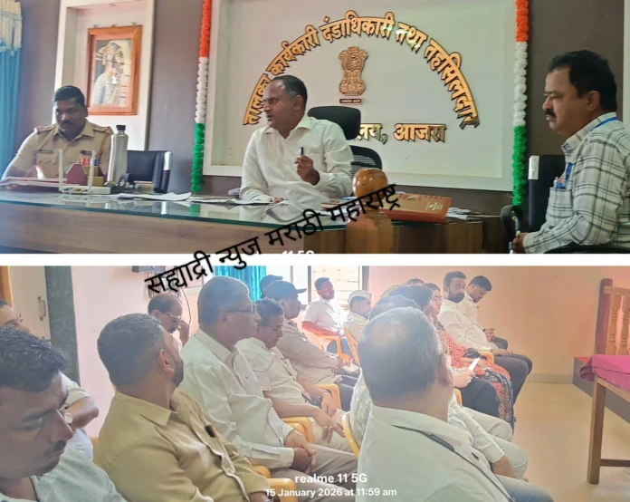 येथील तहसीलदार कार्यालय दालनात जिल्हा परिषद व पंचायत समिती निवडणुकीच्या पार्श्वभूमीवर पदाधिकाऱ्याची बैठक संपन्न झाली. यावेळी तहसीलदार यांनी नामनिर्देशन पत्रासह विविध गोष्टीबाबत माहीती दिली व सूचना केल्या. या वेळी निवासी नायब तहसीलदार म्हाळसाकांत देसाई, आजरा पोलीस ठाण्याचे सपोनि नागेश यमगर उपस्थित होते. तहसीलदार श्री. माने म्हणाले, निवडणूक प्रक्रिया शांततेत पार पाडण्यासाठी सर्वांनी सहकार्य करणे गरजेचे आहे. आचार संहितेबाबत निवडणुक विभागाचे नियम आहेत. ते सर्वांनी पाळावेत. आचारसंहितेचा भंग होणार नाही याची काटेकोर काळजी घ्यावी. तसेच नामनिदर्शन पत्र भरण्यासाठी आफ लाईन भरण्याची व्यवस्था केली आहे.