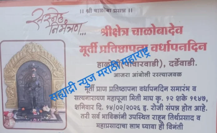 आजरा – आंबोली रोड राष्ट्रीय महामार्ग नजीक श्री. क्षेत्र चाळोबा देव मूर्ती प्राण प्रतिष्ठापना वर्धापनदिन समारंभ व सत्यनारायण महापूजा विधी माघ कृ. १२ शके १९४७, शनिवार दि. १४/०२/२०२६ इ. रोजी संपन्न होत आहे. तरी सर्व भाविक – भक्तांनी भक्तांनी उपस्थित राहून तिर्थप्रसाद व महाप्रसादाचा लाभ घ्यावा. तसेच धार्मिक विधी व महापूजा सकाळी ९.०० वा महाप्रसाद सकाळी ११.०० ते दुपारी ३.०० आहे याची नोंद घ्यावी.