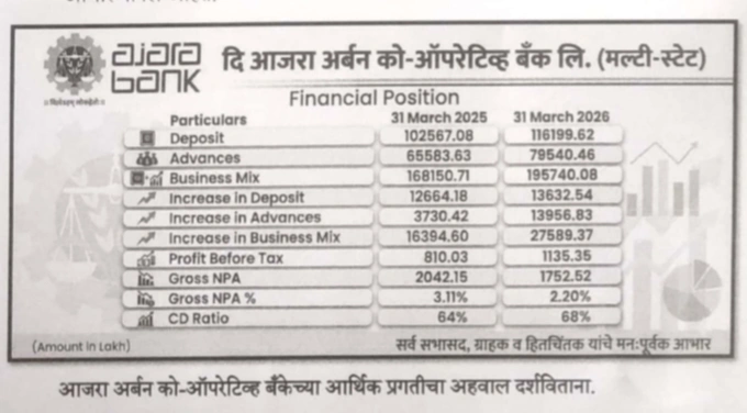 आजरा अर्बन को-ऑपरेटिव्ह बँक लि. (मल्टी-स्टेट) यांनी आर्थिक वर्ष 2025-2026 साठी जाहीर केलेल्या अहवालानुसार बँकेने सर्वच क्षेत्रात उल्लेखनीय प्रगती साधली आहे.