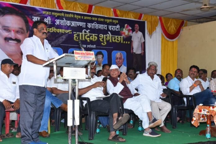 आजरा येथील आण्णा – भाऊ समुहाचे प्रमुख अशोक चराटी यांचा ६४ वा. वाढदिवस विविध मान्यवरांच्या उपस्थितीत संपन्न झाला. अध्यक्षस्थानी जि.प. उपाध्यक्ष जयवंत शिंपी होते. स्वागत डॉ.अनिल देशपांडे यांनी केले. तर प्रास्ताविक विजयकुमार पाटील यांनी केले यावेळी बोलताना जि. प. उपाध्यक्ष श्री शिंपी म्हणाले आजरा तालुक्याच्या विकासासाठी सर्वानी एकत्र येऊन काम करणे गरजेचे आहे मागील चाळीस वर्षात ज्या जबाबदाऱ्या हाती घेतल्या त्या – त्या पार पडल्या आहेत. परंतु राजकारण व समाजकारण करत असताना सोबत तालुक्याचा विकासाच्या दृष्टीने विचार करणे गरजेचे आहे यासाठी यापुढील तालुक्याच्या विकासाला महत्त्व देणे गरजेचे आहे. असे श्री. शिंपी म्हणाले.