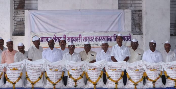 आजरा येथील आजरा सहकारी साखर कारखान्यात चालू गळीत हंगाम २०२१-२२ मध्ये उत्पादित झालेल्या १ लाख ५१ हजाराव्या साखर पोत्यांचे पूजन कारखान्याचे हजेरी पटावरील पहिले कामगार निवृत्ती जानबा जाधव यांच्या सुविद्य पत्नी सौ नंदा निवृत्ती जाधव यांच्या शुभहस्ते व कारखान्याचे चेअरमन सुनील शिंत्रे व सर्व संचालक यांच्या उपस्थित साखरपैती पूजन कार्यक्रम संपन्न झाला.