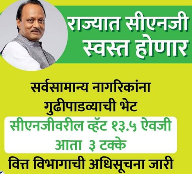 राज्याचे उपमुख्यमंत्री तथा अर्थमंत्री ना. अजितदादा पवार यांनी अर्थसंकल्पामध्ये केलेल्या घोषणेनुसार सीएनजी इंधनावरील मूल्यवर्धित कराचा (व्हॅट) दर १३.५ टक्क्यांवरून ३ टक्के इतका कमी केल्याची अधिसूचना वित्त विभागाकडून जारी करण्यात आली. त्यामुळे राज्यात सीएनजीचे दर कमी होणार असून नवे दर १ एप्रिलपासून लागू होतील. सीएनजी दर कमी करून अर्थमंत्री ना. अजितदादा पवार यांनी सर्वसामान्य नागरिकांना गुढीपाडव्याची भेट दिली आहे.