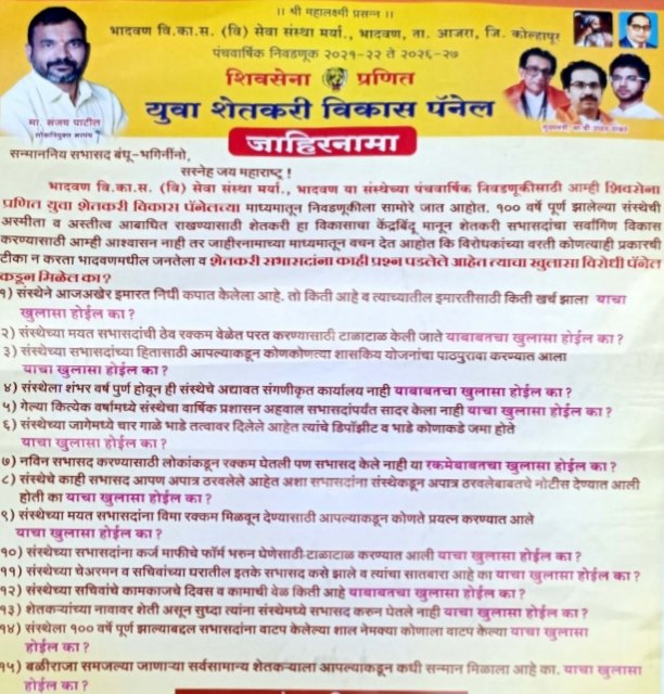 भादवण ता. आजरा येथील दि.१४ रोजी झालेली विकास सेवा सोसायटी निवडणुकी चुरशीची व अटीतटीच्या लढतीमध्ये शिवसेना प्रणित युवा शेतकरी विकास पॅनलचा नऊ जागांवर विजय मिळवत विकास सेवा संस्थेवर एक हाती सत्ता देण्यात यश मिळाले आहे.१०२ वर्षापूर्वीची असलेली ही संस्था या संस्थेमध्ये मागील अनेक वर्ष विरोधकांची सत्ता होती या सत्य मध्ये सत्तांतर करण्यास २०२२ सालात यश मिळाले आहे. या निवडणूक प्रचार दरम्यान मागील पंधरा दिवसांमध्ये दोन्ही आघाडीमध्ये प्रचार यंत्रणा मतदार गाठीभेटी घेत प्रचाराला रंगत आणली होती. विकास सेवा संस्थेमधून आपली सत्ता आल्यास आपण शेतकऱ्यांसाठी काय करणार हा विषय बाजूलाच राहून गेला असल्याचे या निवडणुकीत चित्र दिसत होते. उमेदवारांच्या नेत्याकडून विकास सेवा संस्थेकडून शेतकऱ्यांना मिळवून देण्याचे लाभ यापेक्षाही वेगळी कामे, लाभ देण्याची आमिषे मतदारांना दाखवण्यात आली होती. यामुळे मतदारांच्या भावना दुखावल्या गेल्या, प्रचाराचा मुद्दा बाजूला सोडून तरुण पिढीला दिशाहीन करण्याचे काम या निवडणुकीच्या प्रचारातून मतदारांचा लक्षात येत होते. अशी चर्चा काही मतदारांच्या मध्ये केली जात होती. अशा काही प्रचाराच्या दरम्यान घडलेल्या घटना व विजय पॅनलचा जाहीर केलेला जाहीरनाम्याला मतदारांनी पसंती दाखवली.म्हणून विकास सेवा संस्थेमध्ये शिवसेना प्रणित युवा शेतकरी पॅनलला नऊ जागांवर विजय मिळवता आला असल्याची चर्चा आहे.
