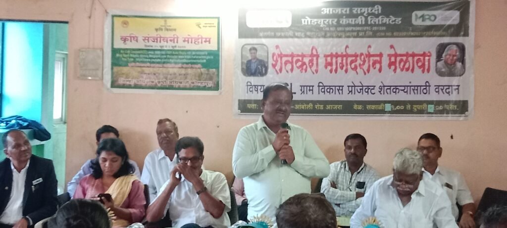 आजरा समृद्धी प्रोडूसर कंपनी लि. आजरा व महाराष्ट्र शासन कृषी विभाग यांचा संयुक्त विद्यमानाने शेतकरी व आजरा समृद्धी ग्रामीण उद्योजक मार्गदर्शक मिळावा दि. २८ रोजी संपन्न झाला. कार्यक्रमाच्या अध्यक्षस्थानी जि. प. चे उपाध्यक्ष जयवंतराव शिंपी होते. प्रास्ताविक आजरा समृद्धीचे कार्यकारी संचालक बाळासाहेब वाघमारे यांनी केले ग्राम उद्योजकांना एमसीएल कंपनीकडून प्राप्त झालेले नियम व सुचना दिल्या येणाऱ्या पंधरा दिवसात सभासद नोंदणीचे काम पूर्ण करण्याचे आवाहन केले. यावेळी प्रामुख्याने महाराष्ट्र शासनाकडून राबवली जात असलेली कृषी संजीवनी मोहीम या मोहिमेबाबत कार्यक्रमासाठी उपस्थित असलेले प्रमुख पाहुणे विभागीय कृषी सहसंचालक बसवराज बिराजदार शेतकऱ्यांना मार्गदर्शन करताना म्हणाले कृषी विभाग महाराष्ट्र शासनाच्या विविध योजना असून उत्पादन मालाची मूळ उत्पादकता साखळी किती गटात हाताळली जाते वेगवेगळ्या साखळीतून विश्वासहर्ता शेतकऱ्यांना मिळावी तसेच वेगवेगळे योजनेचा लाभ शेतकऱ्यांनी घ्यावा कारण शेतकरी हा खूप हुशार आहे. हेच शेतकरी उद्याचे उद्योजक होण्यासाठी धडपड सुरू आहे. एखाद्या प्रकल्पा विषयी पुढे कोण येत असताना आम्ही सहकार्य करत असतो. यासाठी आजचा शेतकरी उद्याचा उद्योजक बनला पाहिजेत यासाठी आमची सहकारी नेहमी राहील. कृषी विभागात बाळासाहेब ठाकरे कृषी योजना, प्रधानमंत्री यंत्र योजना अशा वेगवेगळ्या योजना कृषी विभागाच्या माध्यमातून शेतकऱ्यांना दिल्या जातात याचा लाभ शेतकरी घ्यावा. व एम. सी. एल कंपनी ही कृषी विभागाच्या धोरणानुसार आजरा समृद्धीच्या माध्यमातून तालुक्यात चांगल्या पद्धतीचे काम करून शेतकऱ्यांच्या हाताला काम देत आहे. याचाही लाभ शेतकऱ्यांनी घ्यावा. असेही आवाहन यावेळी सहसंचालक श्री बिराजदार यांनी आपल्या मनोगतातून शेतकऱ्यांना केले. विभागीय कृषी अधिकारी सौ भाग्यश्री पोवार यांनी काजू उद्योगावर तसेच चारसूत्री भात लागवड खतांचा वापर कसा करावा यासाठी जमीन आरोग्य पत्रिका याचा अभ्यास करावा वन शेतकऱ्यांनी कृषी विभागाचे मार्गदर्शन घेत शासनाच्या विविध योजनेचा लाभ घ्यावा असे पोवार बोलताना म्हणाल्या. यावेळी ‘खतांचा संतुलित वापर’ या बाबत मार्गदर्शन अक्षय खानविलकर यांनी केले तसेच डॉ निलकुमार ऐतवडे यांनी ‘खत बचत’ या विषयावर शेतक-यांना मार्गदर्शन केले शेतकऱ्यांना पडलेल्या विविध प्रश्नाची सकारात्मक उत्तर देऊन समाधान केले, आजरा पंचायत समितीचे प्रभारी गटविकास अधिकारी श्री खोराटे यांनी पंचायत समिती कृषी विभाग यांच्याकडून डॉ. बाबासाहेब आंबेडकर कृषी योजनेची लाभार्थ्यांना माहिती दिली.
