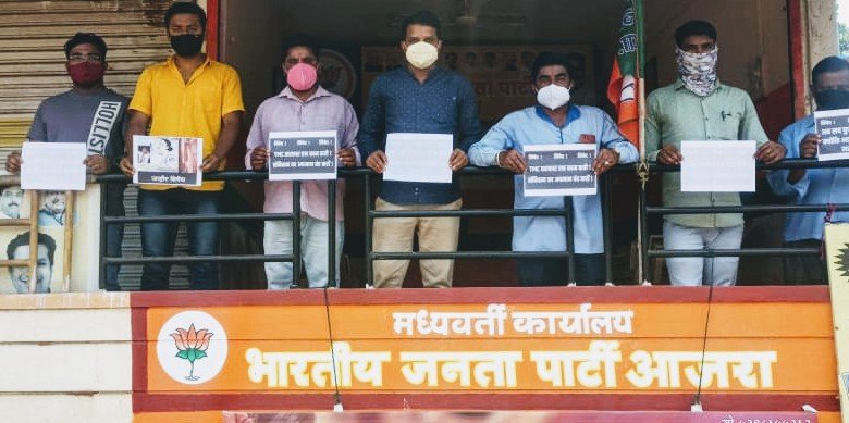 भाजयुमो ने आपल्या जिल्ह्यात भाजप पदाधिकारी आपले कार्यालय अथवा घराबाहेर सोशल डिस्टन्स चे नियम पाळून आंदोलन करावे या आदेशानुसार आजरा येथील कार्यालया समोर आंदोलन करण्यात आले. यावेळी भाजपचे तालुका अध्यक्ष सुधीर कुंभार सह पदाधिकारी उपस्थित होते.