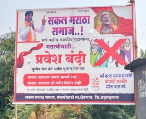 मराठा समाजाला आरक्षण मिळत नाही, तोपर्यंत पुढाऱ्यांना गाव बंदी असणार आहे.आजी-माजी आमदार, राजकीय पुढाऱ्यांना गावात प्रवेश नाही, असे बॅनर लावण्यात आले आहे. मराठा समाजास सरसकट ओबीसीतून ५० टक्क्यांच्या आत आरक्षण देण्याची मागणी या गावाने केली आहे. यासंदर्भात बॅनर्स लावले असून त्यावर सर्व मराठा समाज बांधवांनी कोणत्याही राजकीय पक्षाच्या सभेला जाऊ नये असे आवाहन केले आहे.