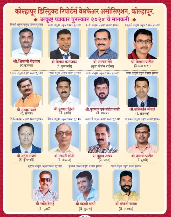 आदी कोल्हापूर जिल्ह्यातील १२ तालुक्यातील पत्रकारांचे पुरस्कार व निपाणी तालुक्यातील पत्रकारांचे पुरस्कार जाहीर झाले.